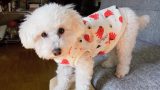 うちのつづみはクリーム色の毛なので断然紺が似合います。濃いめの毛色のわんちゃんにはラベンダーか水色!色違いで着てほしい洋服です。